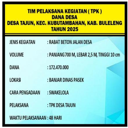 dengan anggaran Dana 172.470.000, dengan Volume Panjang 700 M, Lebar 2,5 M,Tinngi 10 cm. Cara pengadaan dengan swakelola dengan waktu pelaksanaan 48 Hari.
