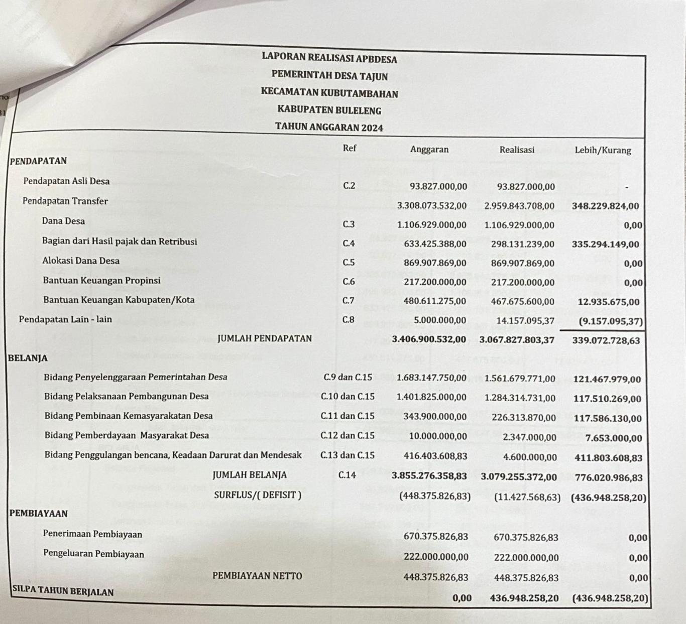 Berdasarkan hasil realisasi pelaksanaan Anggaran Pendapatan dan Belanja Desa (APBDes) Tahun Anggaran 2025, Pemerintah Desa Tajun memperoleh Sisa Lebih Perhitungan Anggaran (SiLPA) sebesar Rp 436.948.258,20.